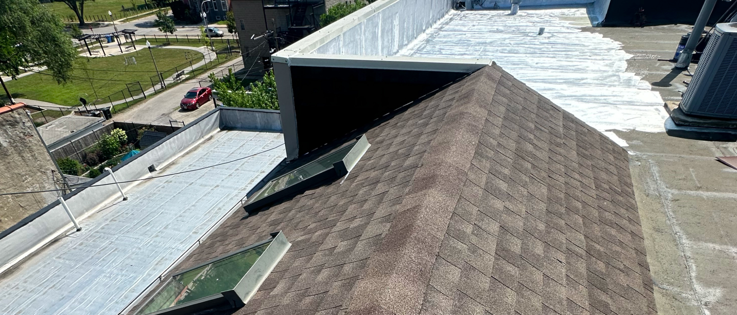 This multi-unit roofing project involved targeted repairs and system upgrades across both pitched and flat roof sections. Our team addressed flashing, skylight integration, and waterproofing details to improve performance while maintaining the building’s structural integrity. The result is a cohesive roofing system designed to protect multiple units and withstand long-term exposure to Chicagoland weather.